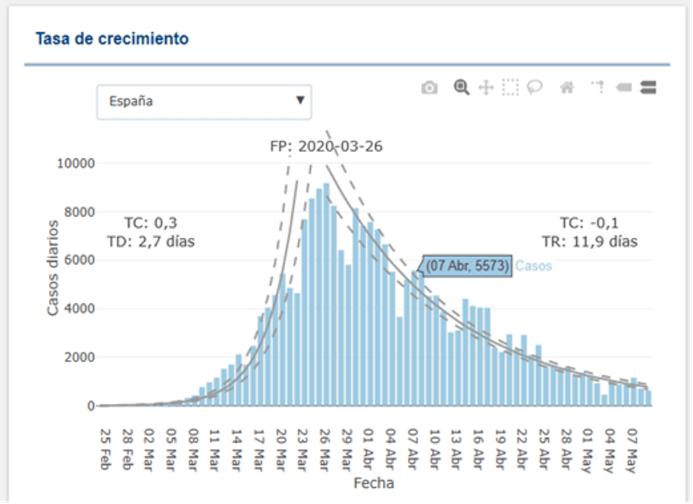 Según los datos del Ministerio de Sanidad a día de hoy, estamos en el buen camino, tanto en la tasa de crecimiento de casos diarios, como en RT o número promedio de contagios que un individuo infectado puede ocasionar en un tiempo determinado (0,77).